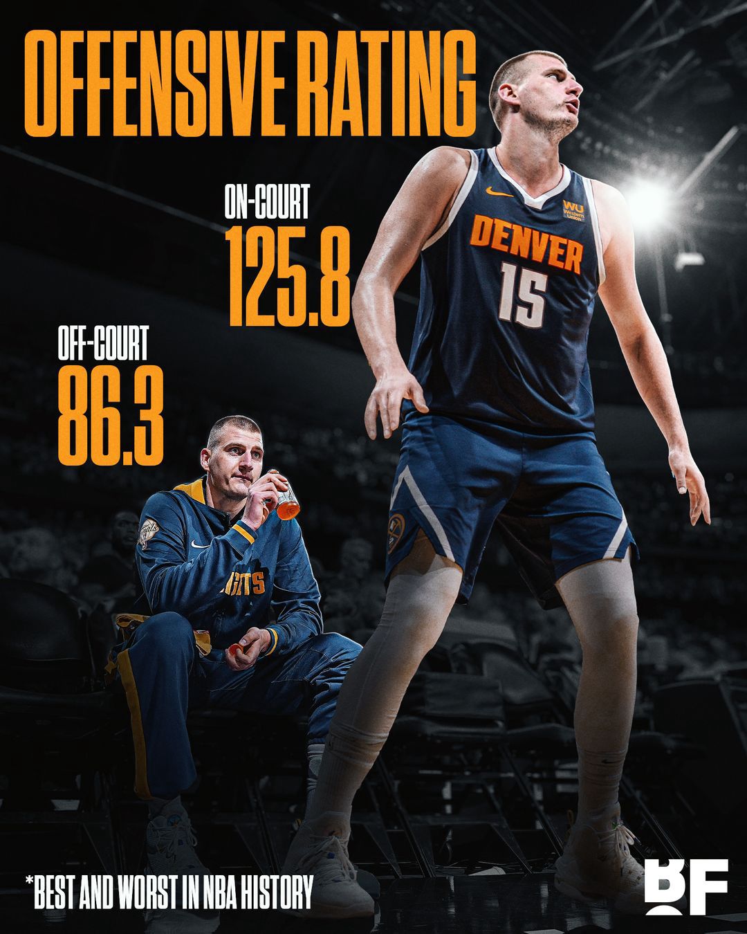 With Nikola Jokić off the floor, the Denver Nuggets' offensive rating is 86.3 - the Worst in #NBA HISTORY.